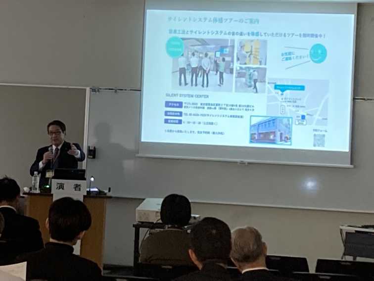 約50名の聴講参加者があり、髙木会長は、株式会社丸高工業のサイレントシステムを一例とし、老朽化が進む医療・福祉施設の現場で求められる「消音リニューアル工事」として、実践事例を紹介しました。